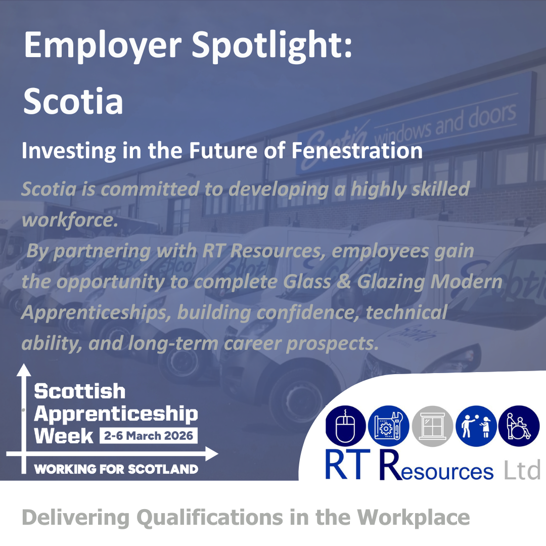 Scotia, a leading employer in the Glass and Glazing industry, has long recognised the importance of investing in staff development to maintain high standards across its operations. To support employee progression, build confidence, and strengthen technical capability, the company partners with RT Resources to offer Modern Apprenticeships in Glass and Glazing, Construction and Business Administration to its workforce.